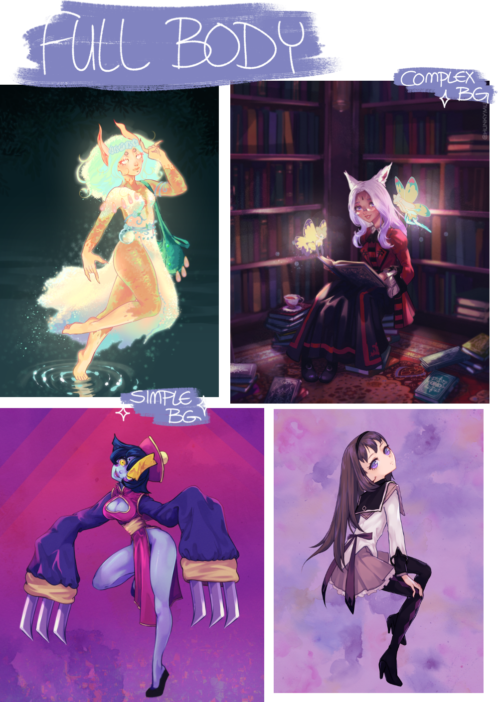 Please note that the base price for one extra after two characters (eg. Two full body/Full color characters would be $300) may be half off each tier, but depending on character detail/posing, I may adjust prices higher accordingly.Simple BG is an additional $10Complex BG is an additional $50