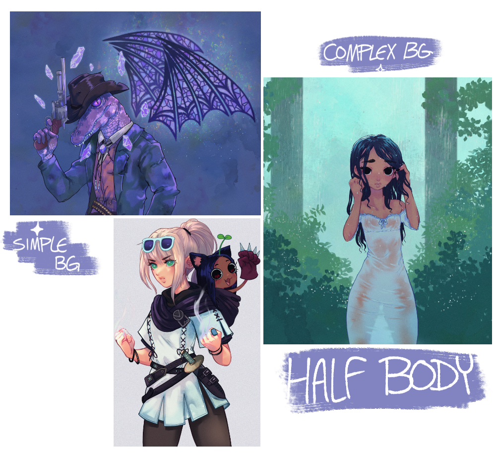 Please note that the base price for one extra after two characters (eg. Two full body/Full color characters would be $300) may be half off each tier, but depending on character detail/posing, I may adjust prices higher accordingly.Simple BG is an additional $10Complex BG is an additional $50